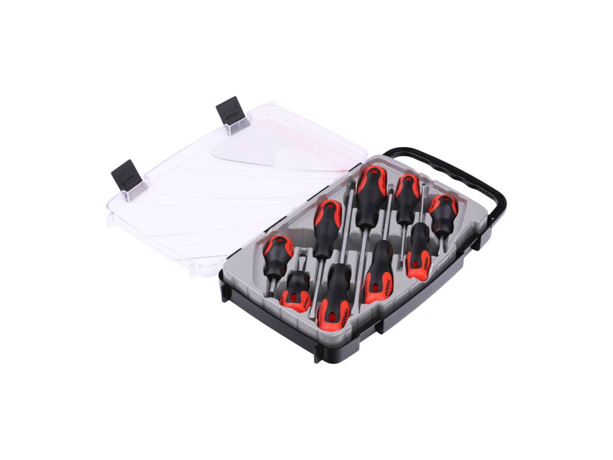 A set of premium screwdrivers, manufactured with hardened and tempered S2 tool steel blades for extra strength and long tool life. Featuring precision ground tips for exceptional fastener driving and a magnetised surface for gripping screws. Featuring an anti-slip soft-grip handle for user comfort, higher driving torque and reduced hand fatigue.