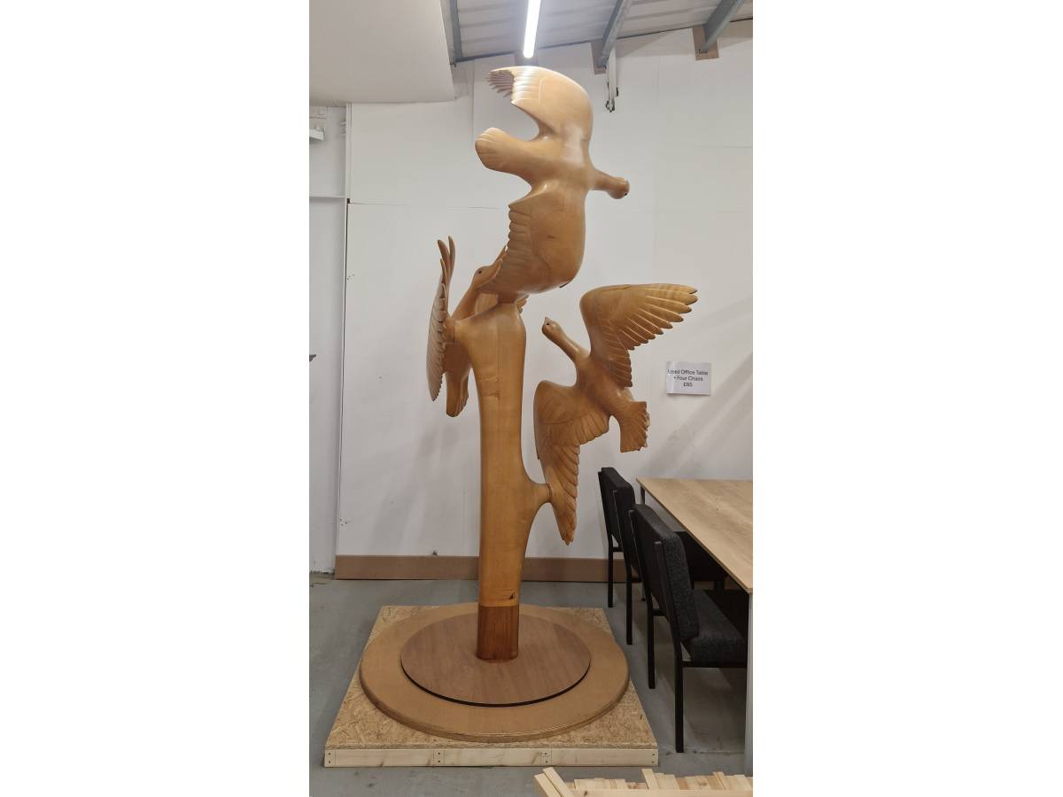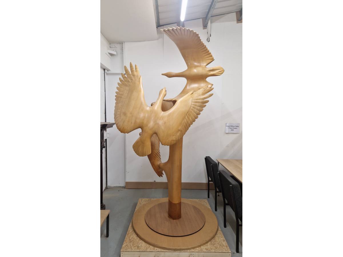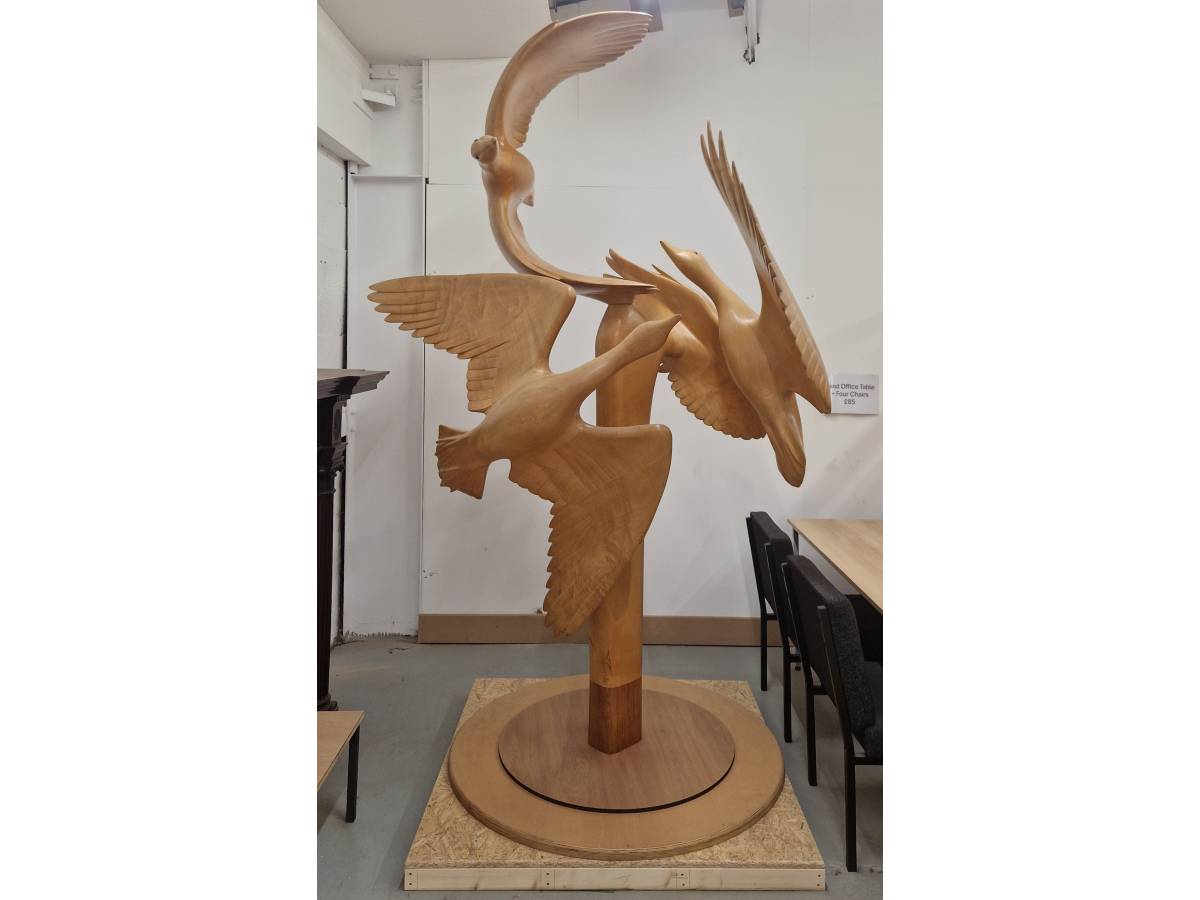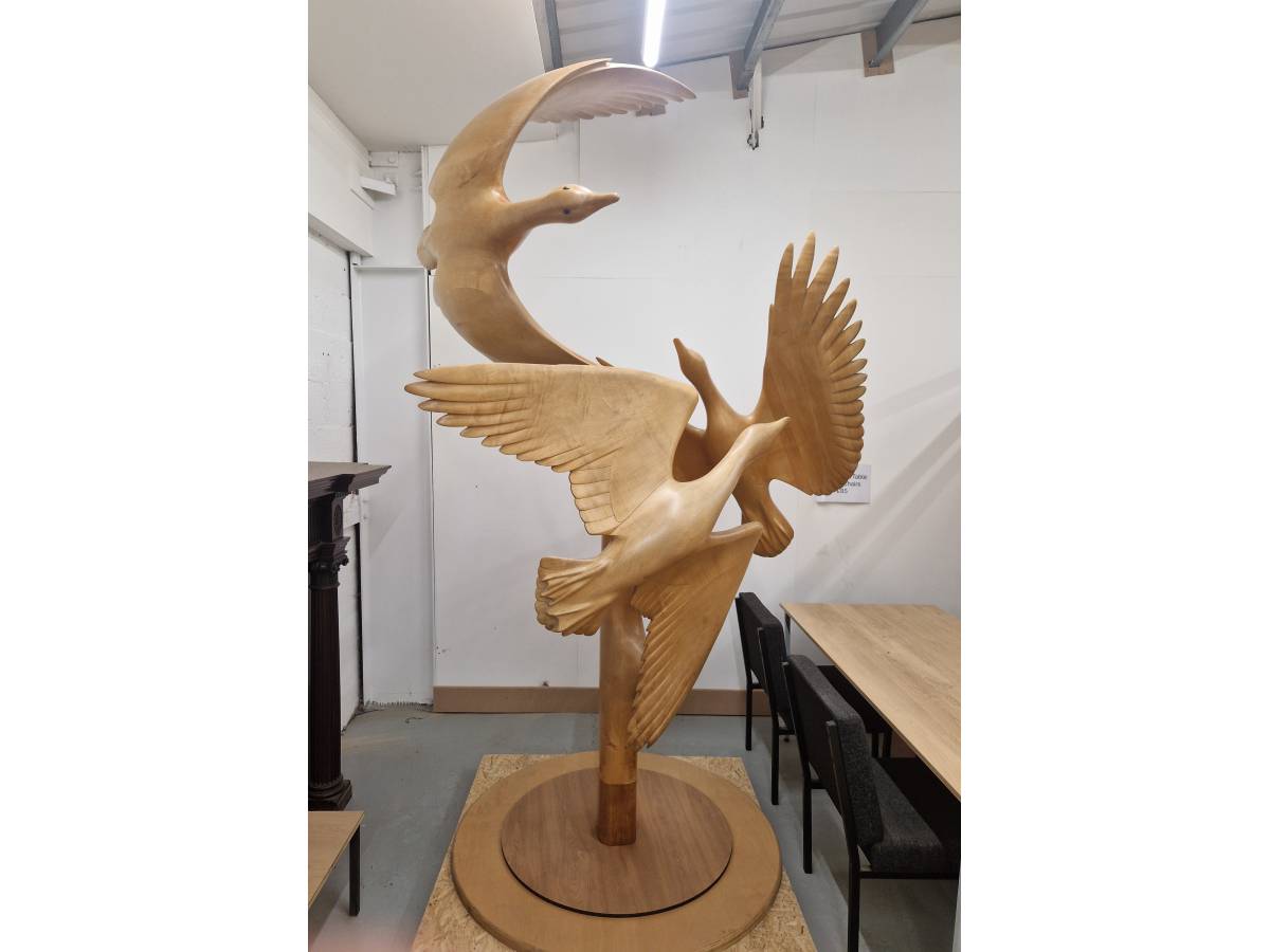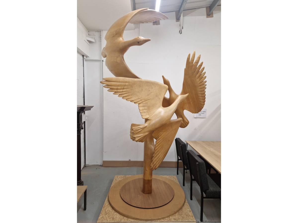 Walter Richie (British 1919-1997) “Flying Geese” (1981-83) Large, rare and impressive sculpture carved in sycamore, ebony and black walnut, designed and executed 1981-83, each bird separately affixed to the shaped central rotating column mounted on a two-part circular base, 274cm high, 162cm wide, the base 120cm diameter. Commissioned by the National Westminster Bank upon specialist advice and designed specifically for a new branch in Worcester where it was displayed before being removed many years later, subsequently acquired April 2012 and renovated that year – the design was inspired by the former name of St. Swithen Street along which the bank partly ran, Goose Lane, this sculpture is listed and illustrated pp. 39-40 of Walter Ritchie Sculpture, pub. Walter Ritchie, Warwick 1994 (ISBN 0 9506205 5 6). Walter Ritchie displayed innate skill from an early age and had become a fully-fledged sculptor by the age of 18, going on to study under Eric Gill as one of his last ever pupils after World War Two. He displayed his skills across many different natural materials over a career which he pursued with a singularly uncompromising artistic vision that characterised his legacy. Ritchie is best known for his depiction of cricketing legend Len Hutton at The Oval, relief carved into brick with a remarkable dynamism and fluidity that Ritchie particularly excelled in, very much mirrored here in “Flying Geese” which equally demonstrates a sense of movement beyond the material, itself expertly handled and sculpted with the utmost attention to detail whilst not losing sight of its overall physical presence in space and undeniable grace. This sculpture presents a very rare opportunity to own the work of an artist who operated in complete contrast to other, more commercially successful sculptors of the era, for example never employing assistants, and shunning both the London scene and wider society to the extent that he only ever had two exhibitions in his lifetime. As such, Ritchie could not be described as a household name and yet, when one considers that his works feature in or on the walls of hospitals, schools, churches, banks, and even cricket grounds, his time will surely come, whether he would like it or not.