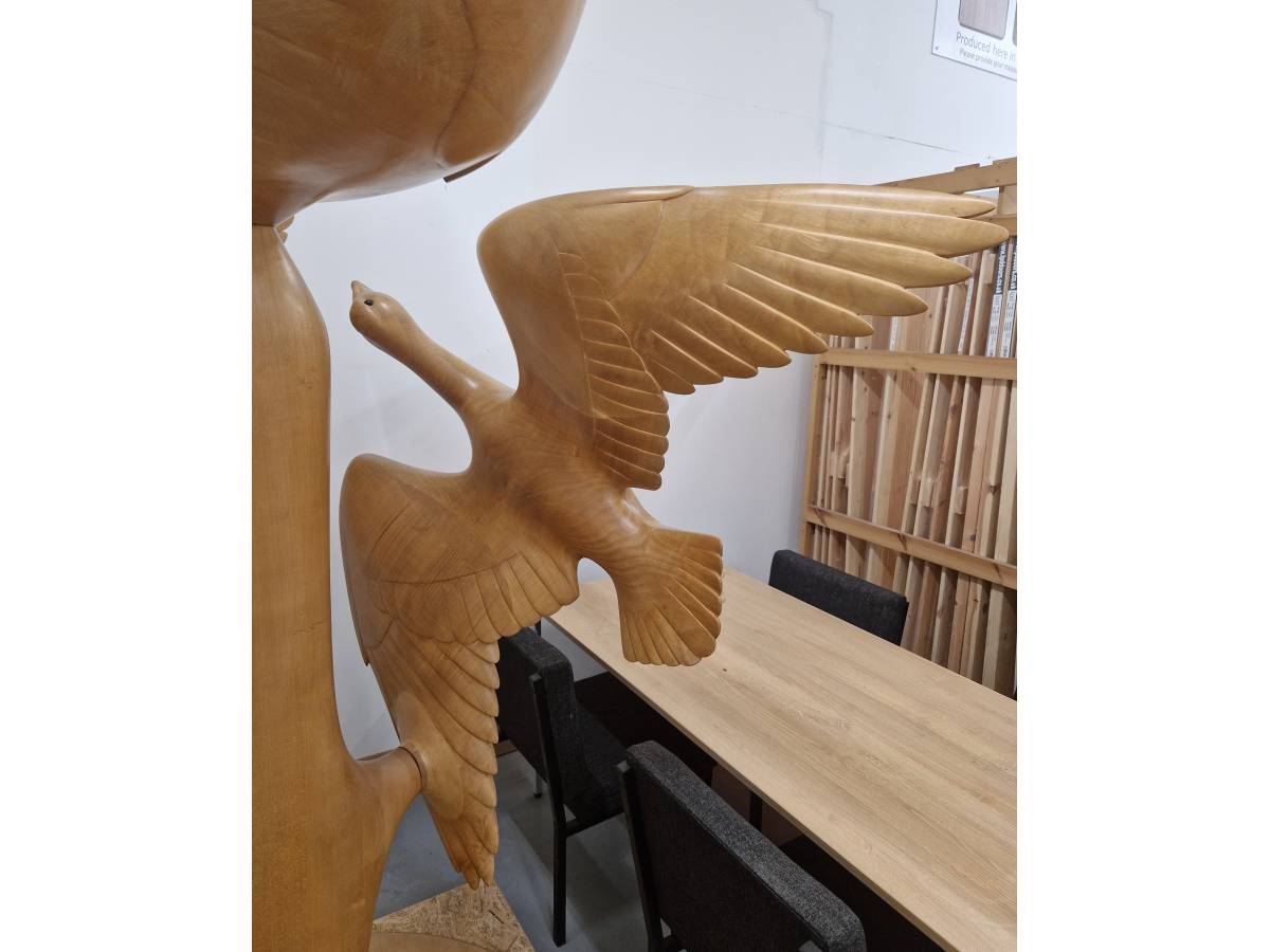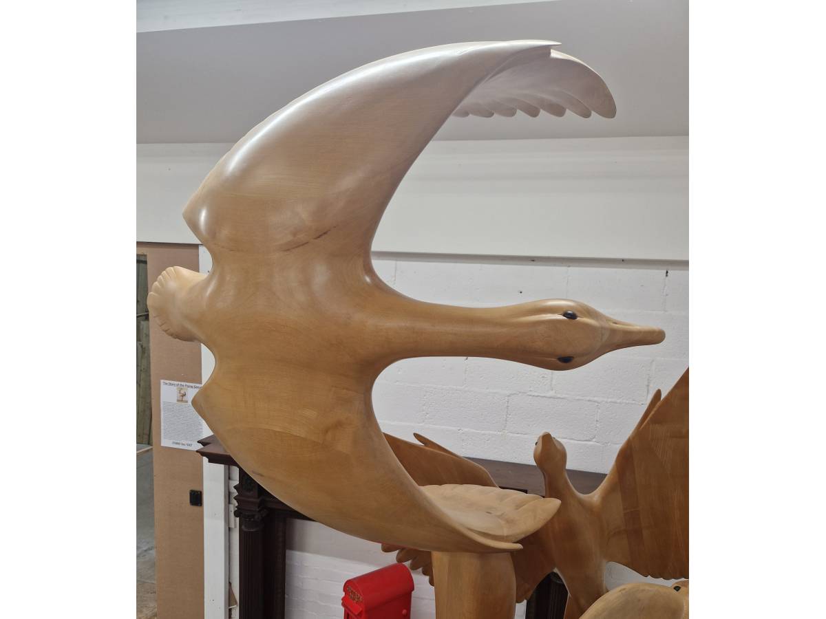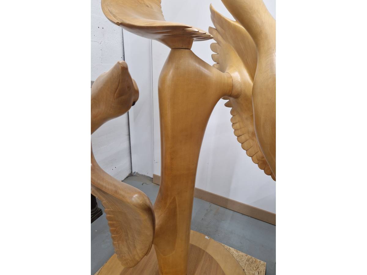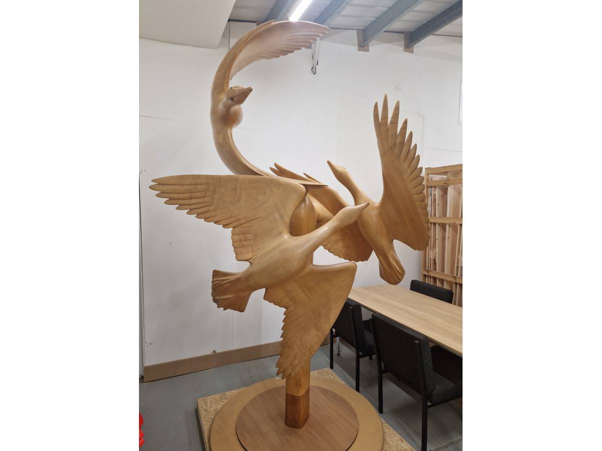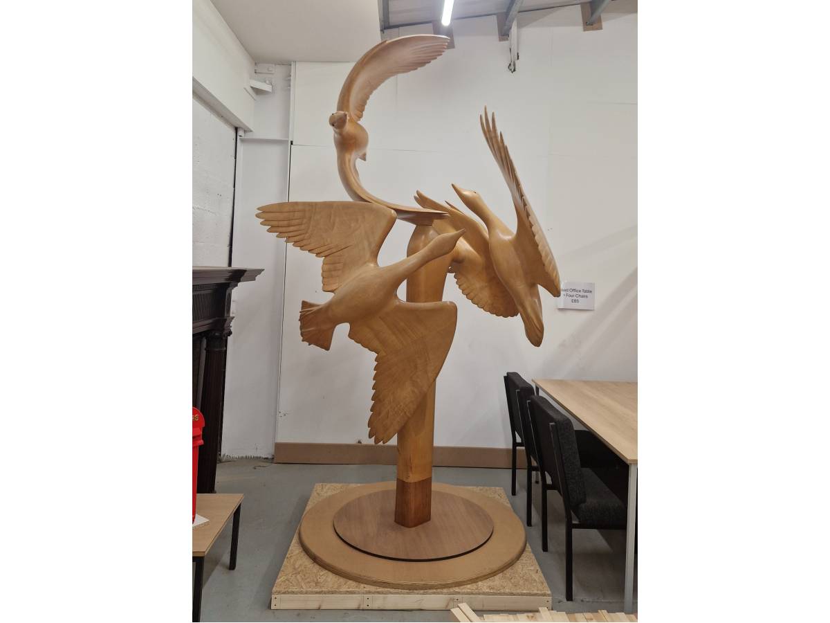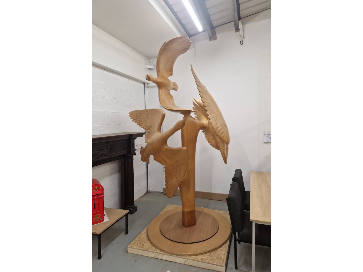 Walter Richie (British 1919-1997) “Flying Geese” (1981-83) Large, rare and impressive sculpture carved in sycamore, ebony and black walnut, designed and executed 1981-83, each bird separately affixed to the shaped central rotating column mounted on a two-part circular base, 274cm high, 162cm wide, the base 120cm diameter. Commissioned by the National Westminster Bank upon specialist advice and designed specifically for a new branch in Worcester where it was displayed before being removed many years later, subsequently acquired April 2012 and renovated that year – the design was inspired by the former name of St. Swithen Street along which the bank partly ran, Goose Lane, this sculpture is listed and illustrated pp. 39-40 of Walter Ritchie Sculpture, pub. Walter Ritchie, Warwick 1994 (ISBN 0 9506205 5 6). Walter Ritchie displayed innate skill from an early age and had become a fully-fledged sculptor by the age of 18, going on to study under Eric Gill as one of his last ever pupils after World War Two. He displayed his skills across many different natural materials over a career which he pursued with a singularly uncompromising artistic vision that characterised his legacy. Ritchie is best known for his depiction of cricketing legend Len Hutton at The Oval, relief carved into brick with a remarkable dynamism and fluidity that Ritchie particularly excelled in, very much mirrored here in “Flying Geese” which equally demonstrates a sense of movement beyond the material, itself expertly handled and sculpted with the utmost attention to detail whilst not losing sight of its overall physical presence in space and undeniable grace. This sculpture presents a very rare opportunity to own the work of an artist who operated in complete contrast to other, more commercially successful sculptors of the era, for example never employing assistants, and shunning both the London scene and wider society to the extent that he only ever had two exhibitions in his lifetime. As such, Ritchie could not be described as a household name and yet, when one considers that his works feature in or on the walls of hospitals, schools, churches, banks, and even cricket grounds, his time will surely come, whether he would like it or not.