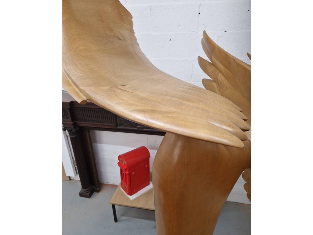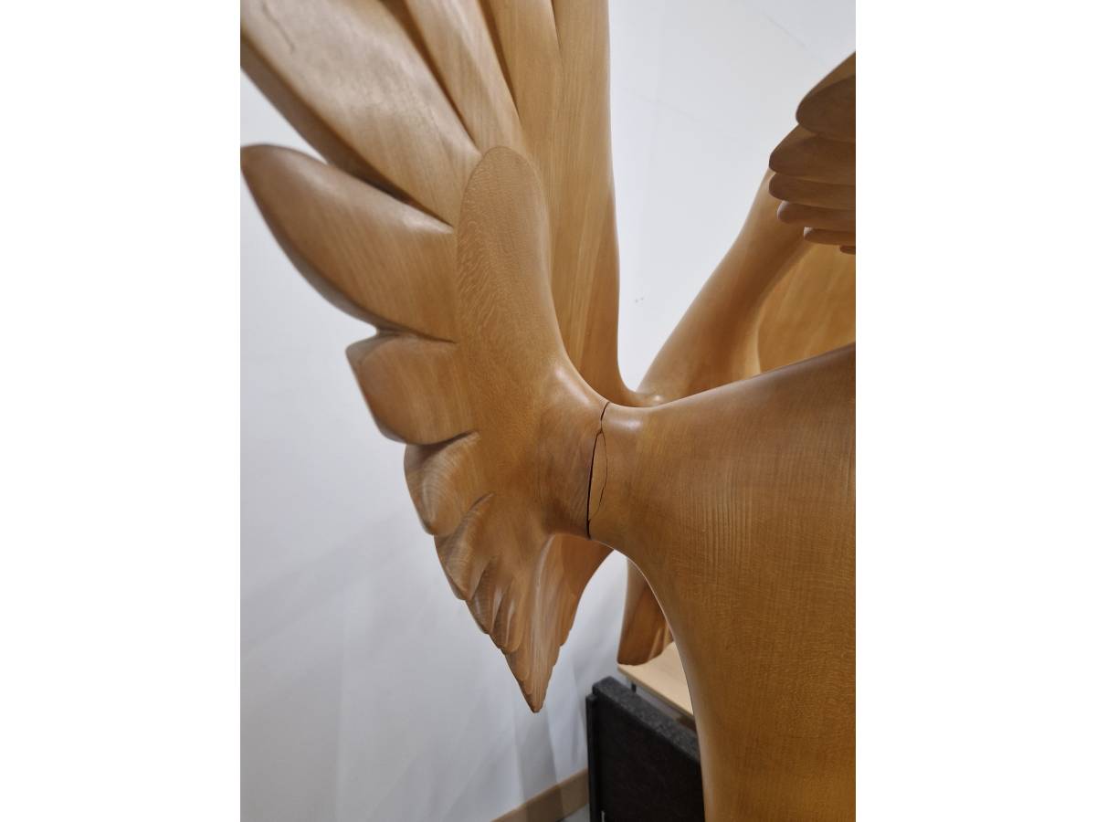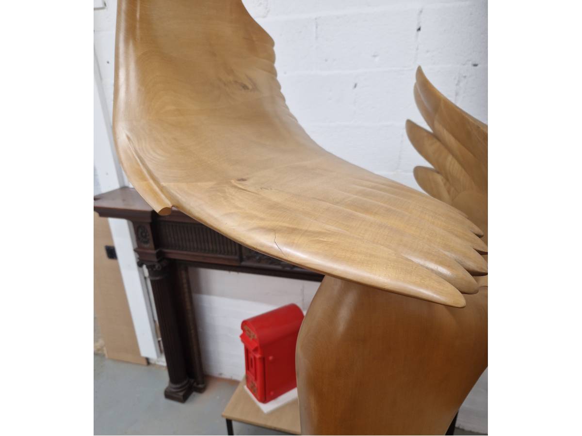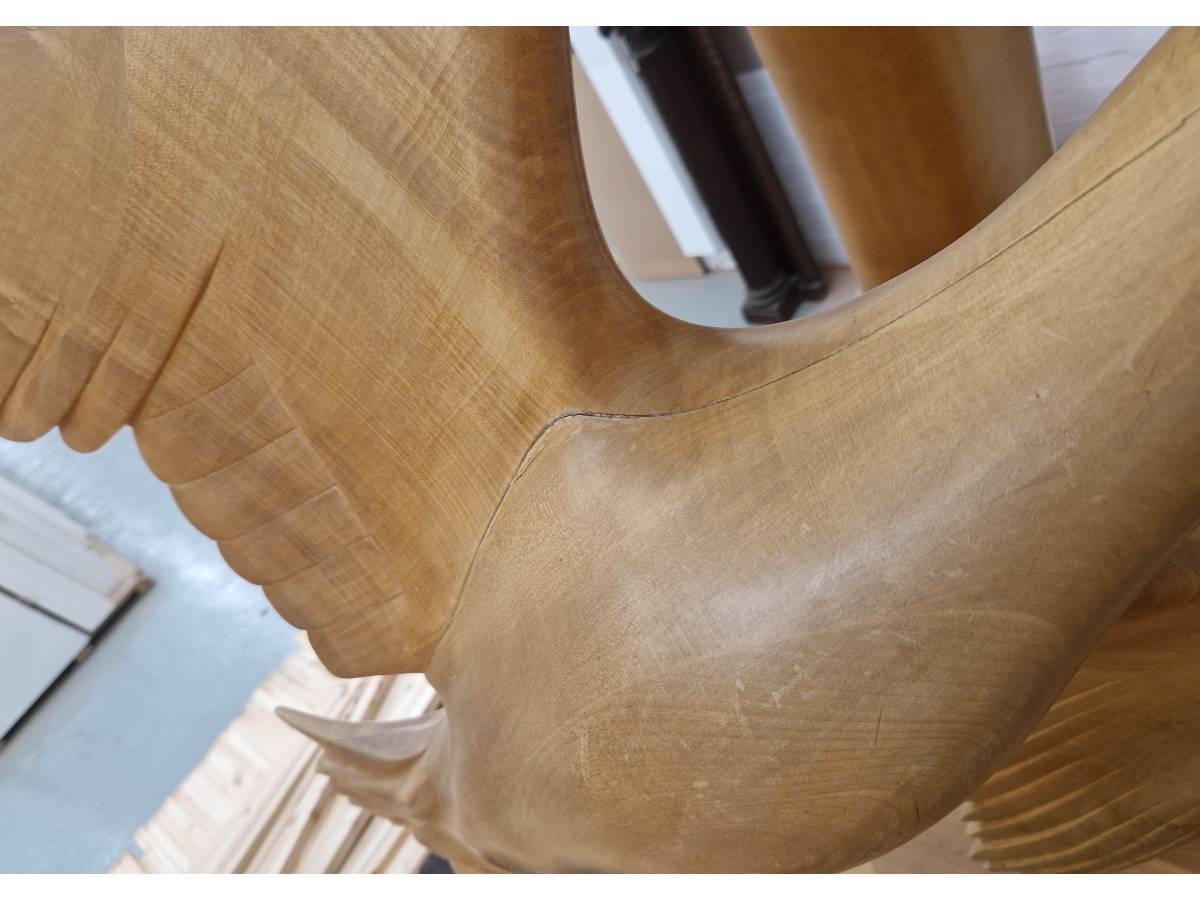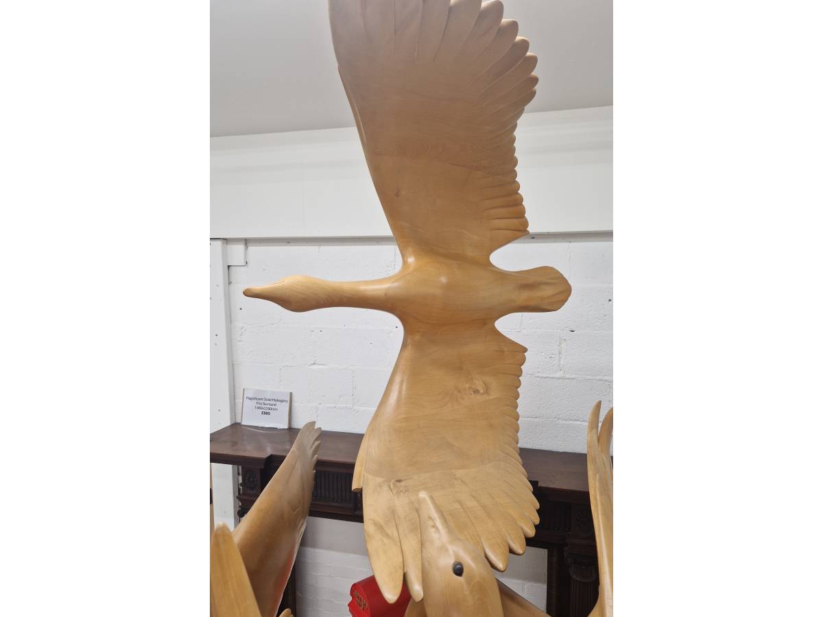 Walter Richie (British 1919-1997) “Flying Geese” (1981-83) Large, rare and impressive sculpture carved in sycamore, ebony and black walnut, designed and executed 1981-83, each bird separately affixed to the shaped central rotating column mounted on a two-part circular base, 274cm high, 162cm wide, the base 120cm diameter. Commissioned by the National Westminster Bank upon specialist advice and designed specifically for a new branch in Worcester where it was displayed before being removed many years later, subsequently acquired April 2012 and renovated that year – the design was inspired by the former name of St. Swithen Street along which the bank partly ran, Goose Lane, this sculpture is listed and illustrated pp. 39-40 of Walter Ritchie Sculpture, pub. Walter Ritchie, Warwick 1994 (ISBN 0 9506205 5 6). Walter Ritchie displayed innate skill from an early age and had become a fully-fledged sculptor by the age of 18, going on to study under Eric Gill as one of his last ever pupils after World War Two. He displayed his skills across many different natural materials over a career which he pursued with a singularly uncompromising artistic vision that characterised his legacy. Ritchie is best known for his depiction of cricketing legend Len Hutton at The Oval, relief carved into brick with a remarkable dynamism and fluidity that Ritchie particularly excelled in, very much mirrored here in “Flying Geese” which equally demonstrates a sense of movement beyond the material, itself expertly handled and sculpted with the utmost attention to detail whilst not losing sight of its overall physical presence in space and undeniable grace. This sculpture presents a very rare opportunity to own the work of an artist who operated in complete contrast to other, more commercially successful sculptors of the era, for example never employing assistants, and shunning both the London scene and wider society to the extent that he only ever had two exhibitions in his lifetime. As such, Ritchie could not be described as a household name and yet, when one considers that his works feature in or on the walls of hospitals, schools, churches, banks, and even cricket grounds, his time will surely come, whether he would like it or not.