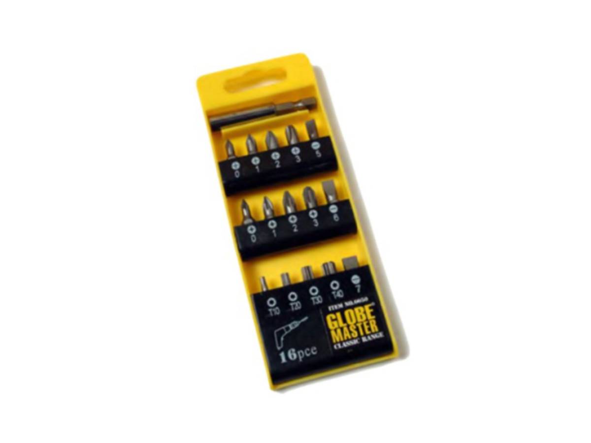 Bit set and extension bar in a handy rubber bit housing. 60mm magnetic extension bar included. Includes: Pozi, Phillips, Torx and Flat bits.
